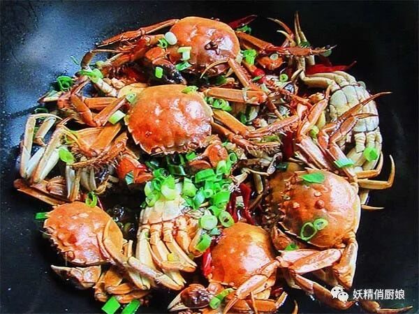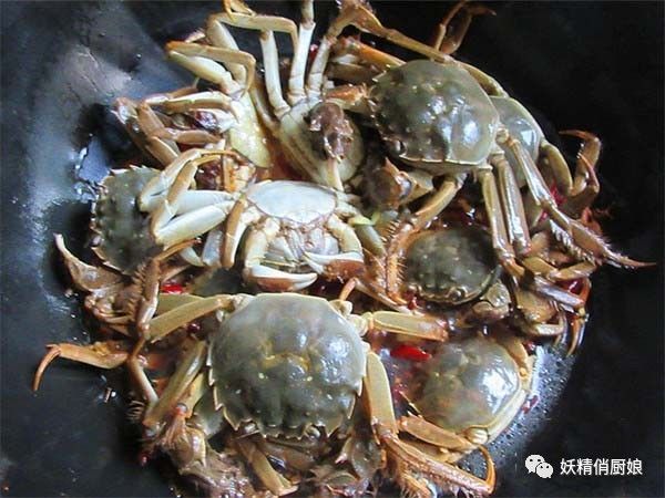 4.倒入螃蟹,立即快速盖上锅盖,需要大约10分钟左右,焖至汁快干的时候。