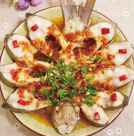 做法:1)鱼去鳞、洗净2)去头去尾切段,葱姜切丝,小红辣椒切片3)鱼段加入黄酒腌制10分钟,将鱼段放入盘中,摆成孔雀开屏状,再摆入鱼头和鱼尾,放入姜丝4)起油锅放入剁椒蒸鱼豉油稍微煸炒5)将酱料均匀铺在鱼上,将鱼放蒸锅中,上汽后大火蒸8分钟左右即可6)取出蒸好的鱼,放上葱末,辣椒圈点缀