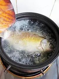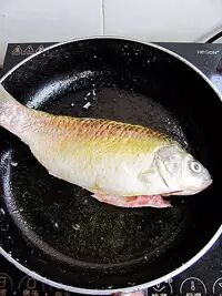 去鳞洗净的鱼先用少许盐将鱼身擦一下,然后起油锅将鱼的两面煎一下,煎至鱼皮呈金黄色。油煎是为了让鱼固定身形的同时,吸收一定的油脂。煎鱼不用怕粘锅,更多小技巧看这里: