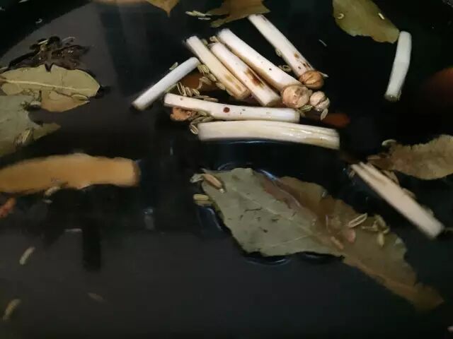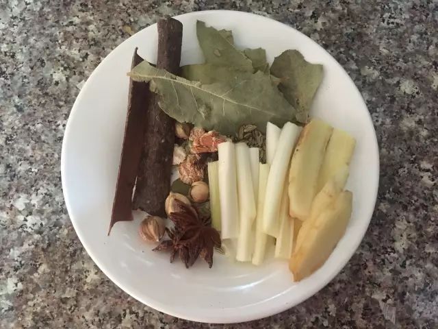 2. 八角,香叶,桂皮,茴香籽,草果,山柰,丁香,肉蔻,葱段,姜片备用