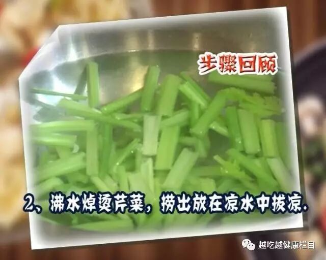 芹菜洗净去叶,切成寸段儿。放热水中焯烫后过凉备用。