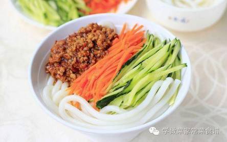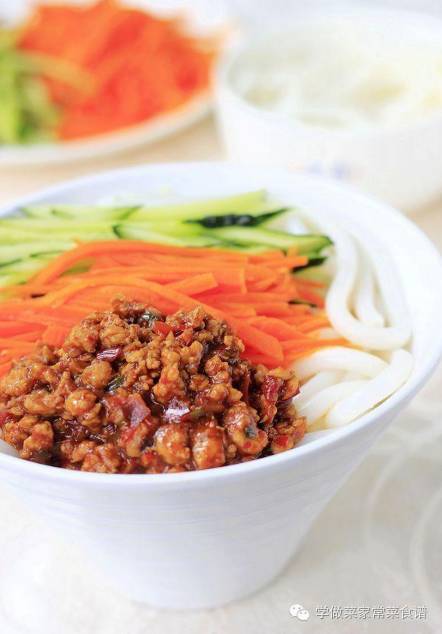 5、把米粉在开水里焯烫2分钟捞起装碗,浇上炸酱,铺上黄瓜丝、胡萝卜丝即可