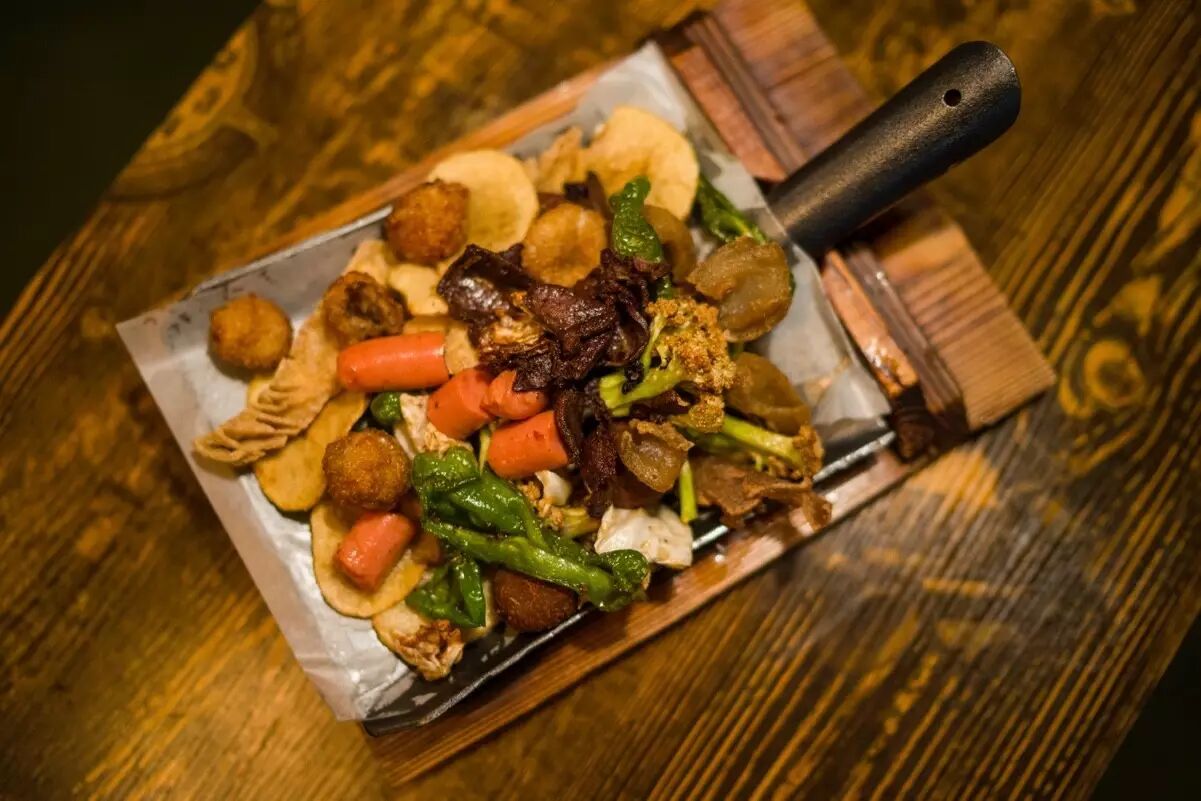 炸炸上桌的时候用的是铁锹装,挺有意思的。