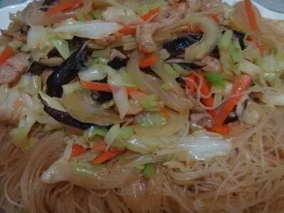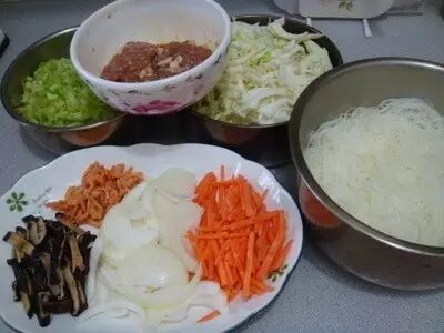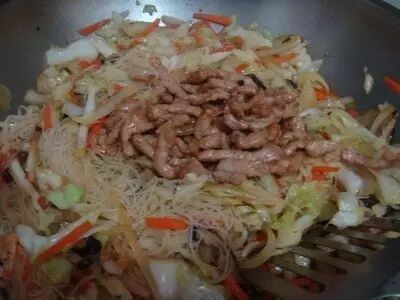1步骤1准备材料请点图放大喔.米粉用热水川烫15炒捞起备用.猪肉丝用腌料腌20分