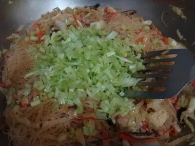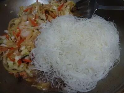 炒米粉需要比炒菜的油还多一点用2只大筷子一起拌炒会比较好拌匀.