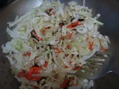 5步骤5再下高丽菜略炒.加入调味料.高汤拌匀.中间可试一下味道不够咸再加盐.没有冈汤可用泡香菇的水代替.不要倒掉喔