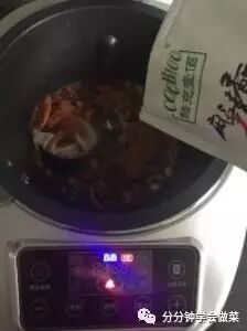 14.倒入干辣椒、大葱、洋葱、麻辣香锅调料,启动炒菜功能炒匀,大约半分钟;