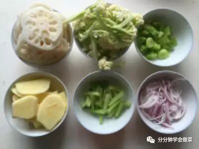 2.将花菜、莴笋、芹菜、土豆、莲藕、洋葱洗净,去皮的去皮,切好备用;