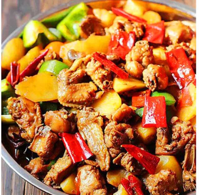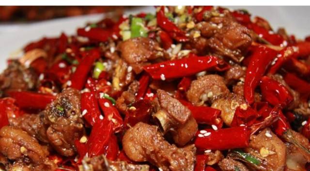 在满盘红亮的辣椒中慢慢寻找鸡丁,