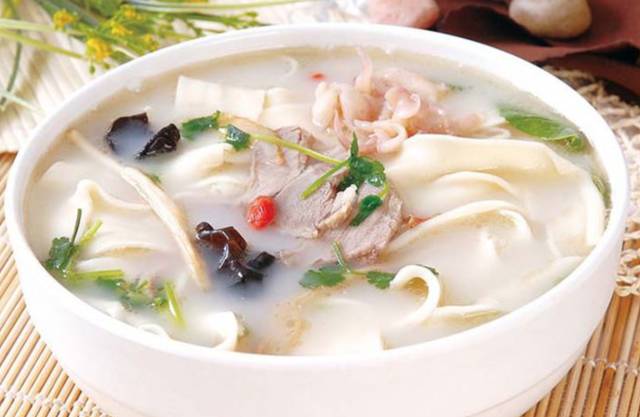 汤用上等嫩羊肉、羊骨一起煮五个小时以上,