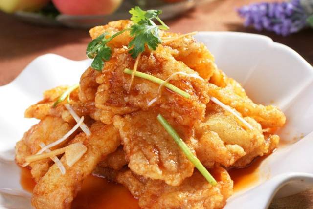 以猪里脊、鸡蛋、葱姜末、料酒、盐、面粉等为原料,