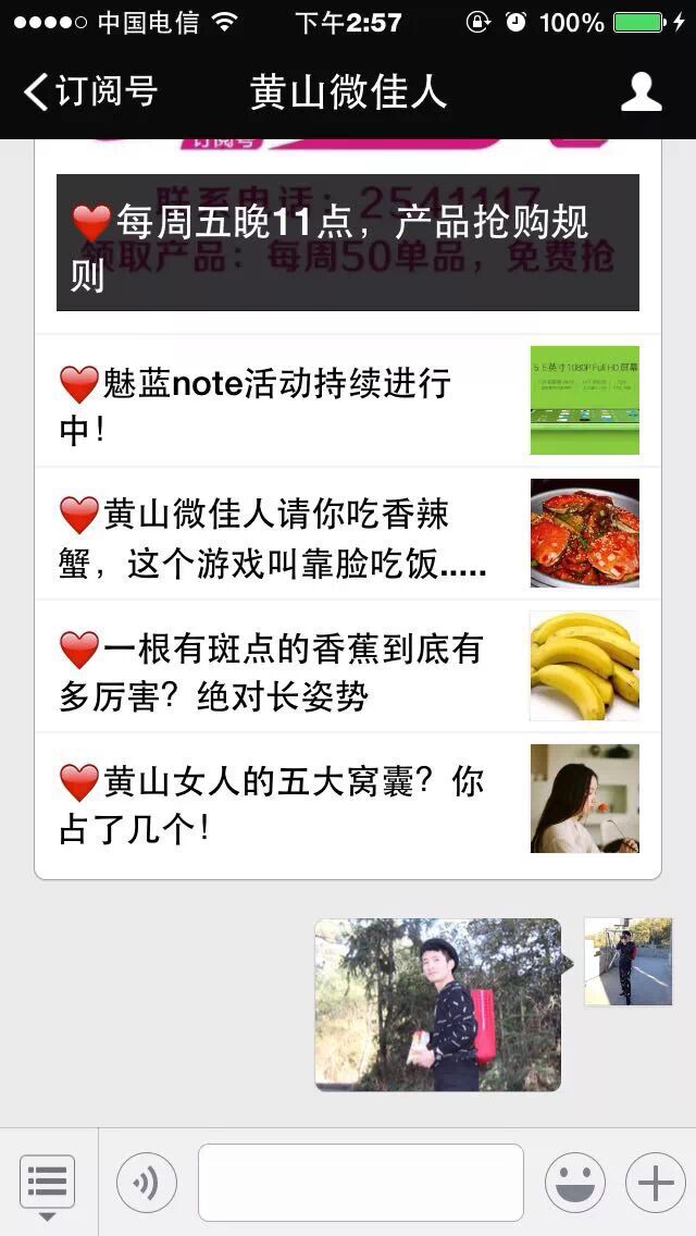 活动规则:回复本公众平台,发送您的自拍照。留下姓名和联系方式。每周星期五发布中奖名单,由黄山微佳人联系您,并将消费编码发送至您微信。凭消费编码周末您就可以吃大餐咯!
