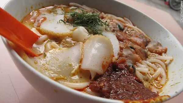 米粉浸泡在辣的娘惹咖喱和叻沙中,加入姜,葱,辣椒,干虾酱(马来),香茅,煮入味,用新鲜的椰奶加厚,娘惹菜系最经典的叻沙就完成了。