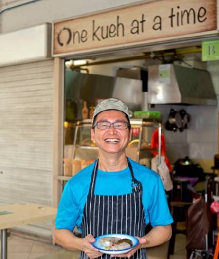 Nick Soon, 原来是个保险从业人员, 现在他也是一个小摊贩主,靠传统的手艺持家。八个月前,Nick Soon 的小摊铺One Kueh At A Time(Kueh 粿)在惹兰白锡食品中心(Jalan Berseh Food Centre)开业了,主要是卖潮汕粿(一种糯米团,有或甜或咸味的馅料)。