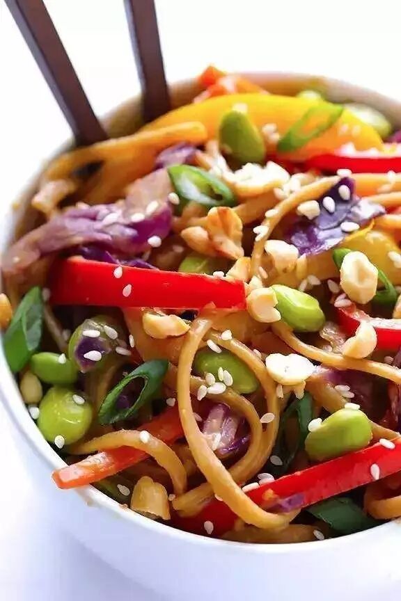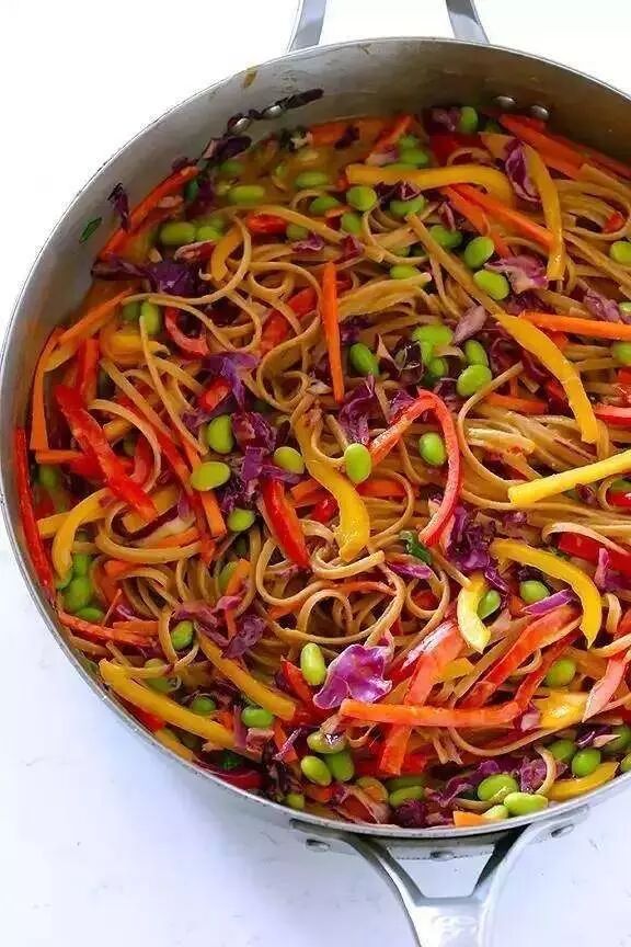 面条、1勺花生油或橄榄油、1个红甜椒、1个黄甜椒、1根胡萝卜、紫甘蓝、毛豆、葱、芝麻、花生碎、50ml花生酱、2勺酱油、2勺食醋、新鲜生姜、大蒜