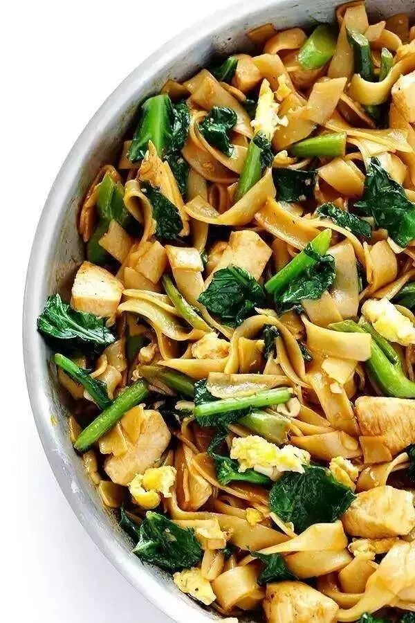 4.热油,爆香蒜粒,将鸡肉、芥蓝一起放进锅里翻炒3分钟后倒入河粉,加入适量酱油、米酒、醋和糖调味,炒匀后即可出锅