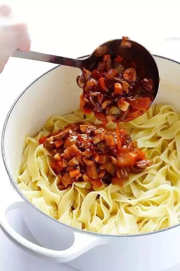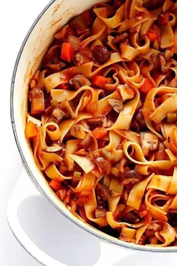 面条、2勺黄油或橄榄油、1个洋葱、1个胡萝卜、芹菜、肉丁、4瓣大蒜、新鲜蘑菇、3杯红葡萄酒、3杯高汤、番茄酱、红辣椒、盐、黑胡椒、干奶酪