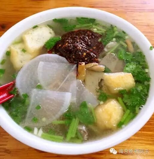 在南京排前三是绝对没有问题的。汤是老鸭汤,粉丝爽滑有嚼劲。还有两样独门绝技:萝卜片和锅巴。萝卜片软软的很爽口,锅巴泡在汤里更鲜。
