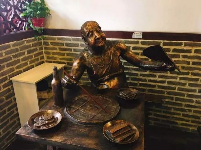 一楼的格局偏狭长,门口的雕塑憨态可掬,宽宽的板凳颇有些重庆街头老店的味道。