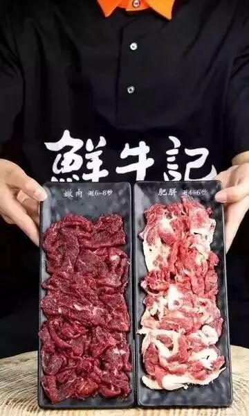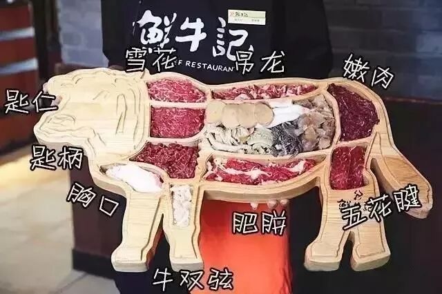 全牛宴,用的是云南贵州2-3岁土黄牛,分割出牛的每个部位,下刀时和牛肉的纹理呈90°,把肉切得厚薄均一,要达到下锅不超过10秒必熟的程度,这就是传说中的“秒牛”。每个部位都讲究涮的顺序:从瘦到肥,嫩肉 - 匙柄- 匙皮- 雪花- 吊龙- 肥胼- 胸口。这样汤底才会保持清爽、鲜甜的口感。