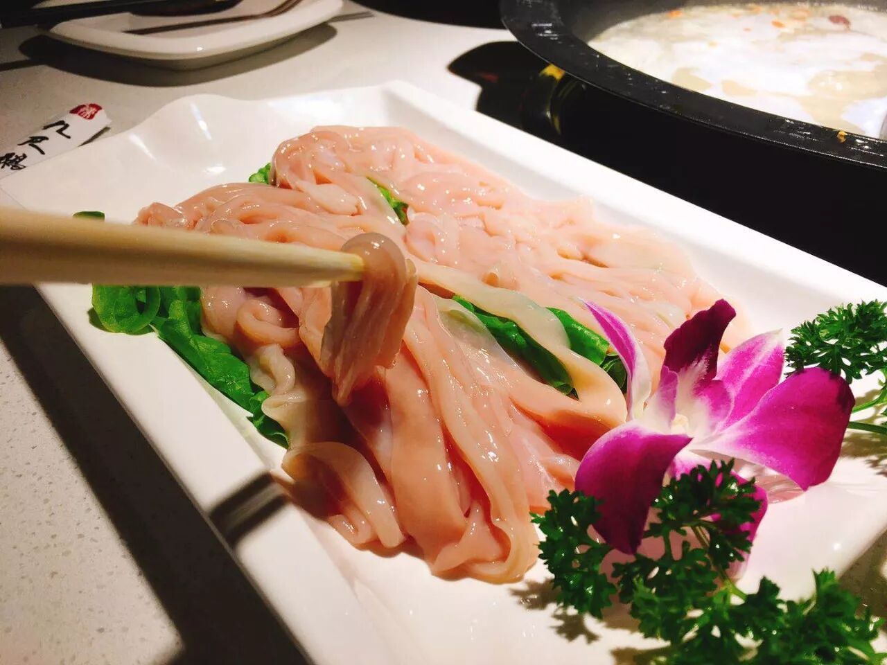 除了这些,空运过来的大片水牛毛肚、雪花牛肉也很值得一尝。